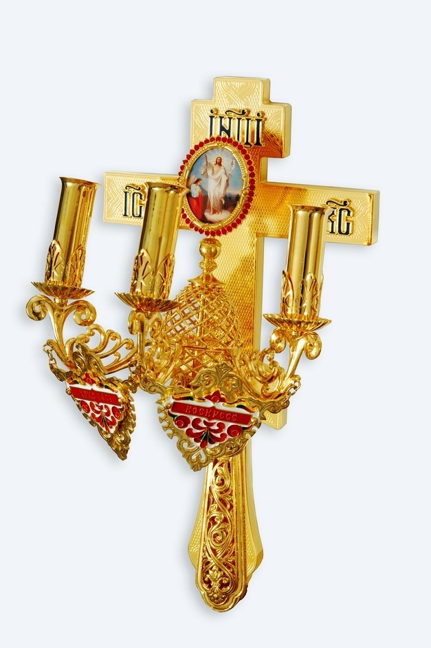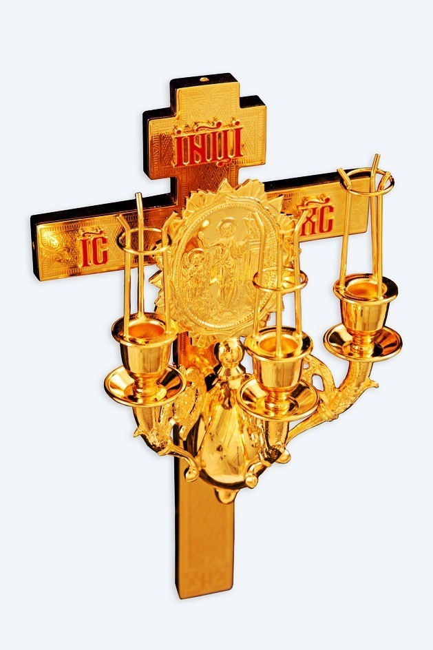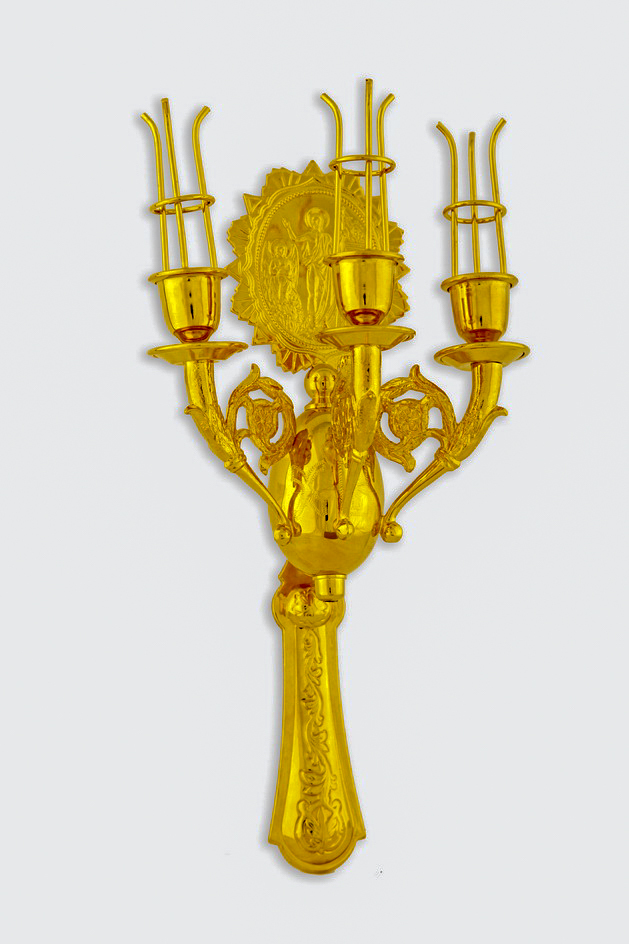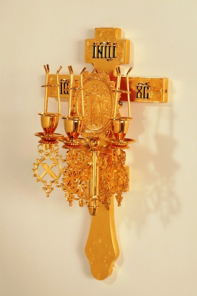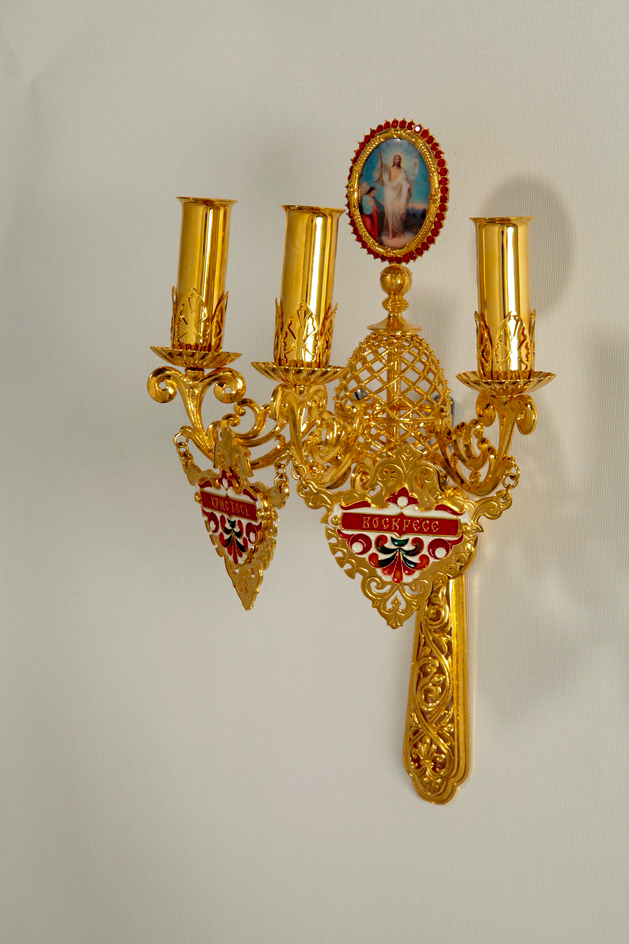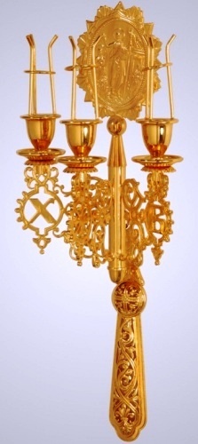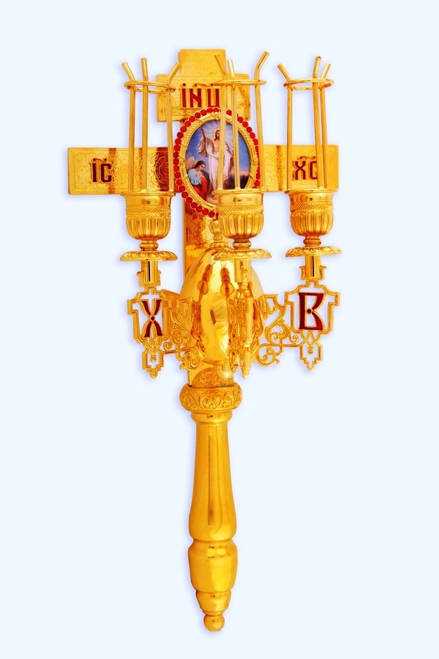 Трехсвечник пасхальный на ручке применяется совместно с Набором свечей для Пасхального трехсвечника во время Пасхальной седмицы. Трехсвечник покрыт тонким слоем золота в знак того, что эта церковная вещь предназначена Богу, как Царю царей и Господу господствующих